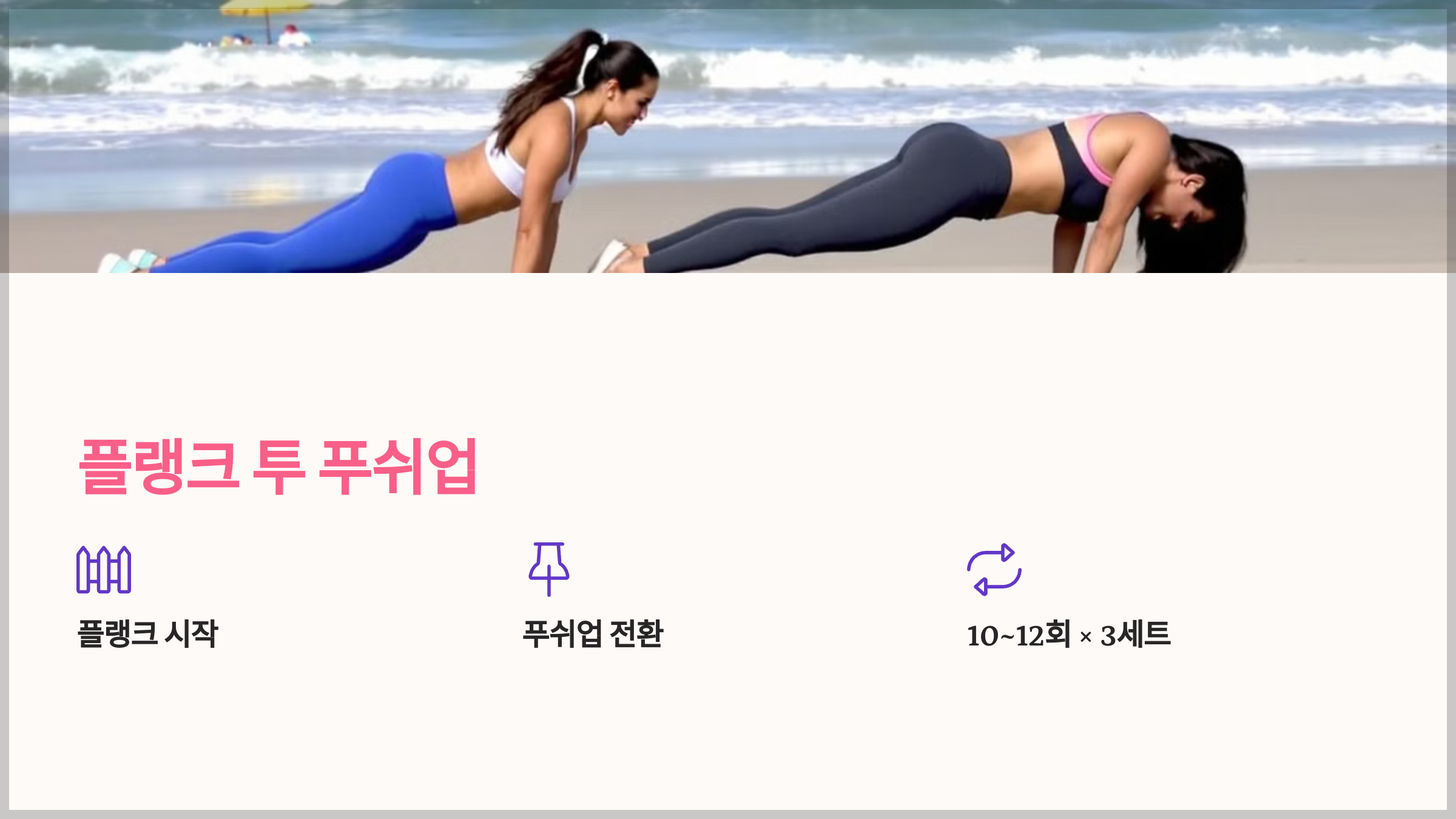 - 플랭크 자세에서 한쪽 팔을 펴며 푸쉬업 자세로 전환합니다.