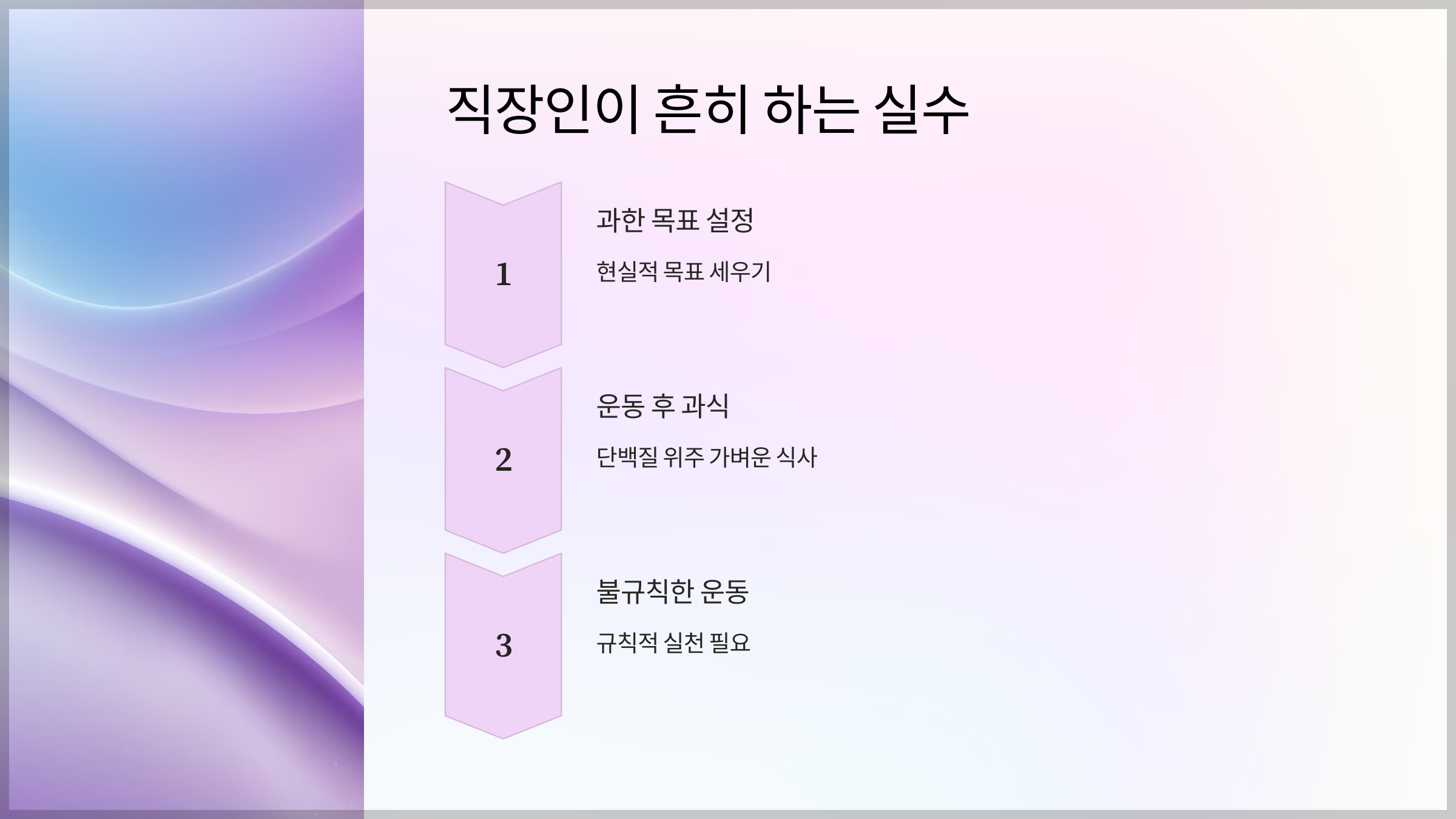 - 불규칙한 운동: 꾸준하지 않으면 효과를 볼 수 없습니다. 👉 일정을 정해 규칙적으로 실천하세요.