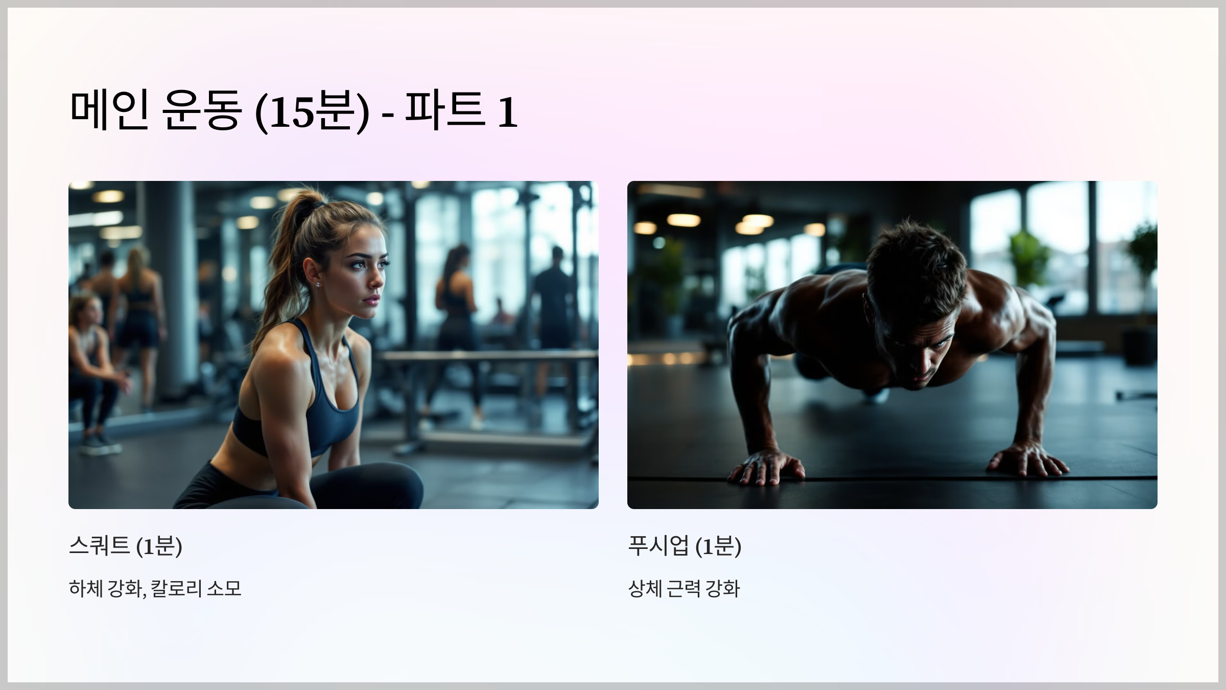 - 푸시업 (1분): 상체 근력을 강화하는 기본 동작.