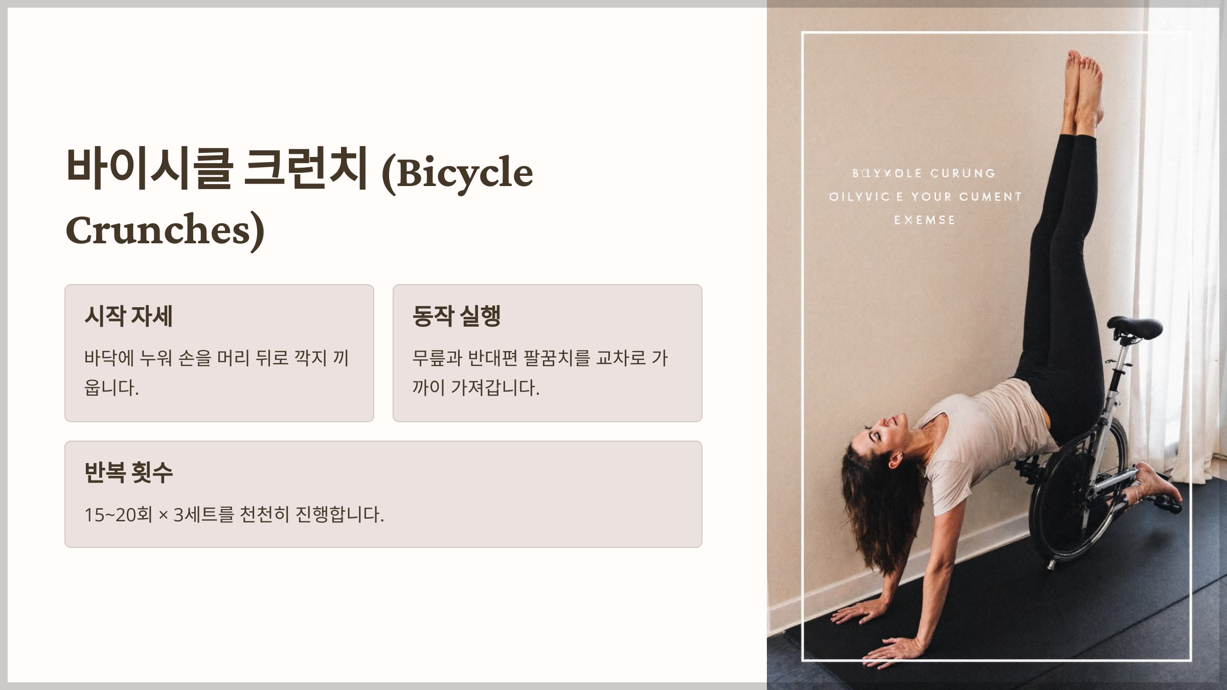 - 양쪽 무릎을 교대로 가슴 쪽으로 당기며 반대편 팔꿈치를 무릎 쪽으로 가져갑니다.