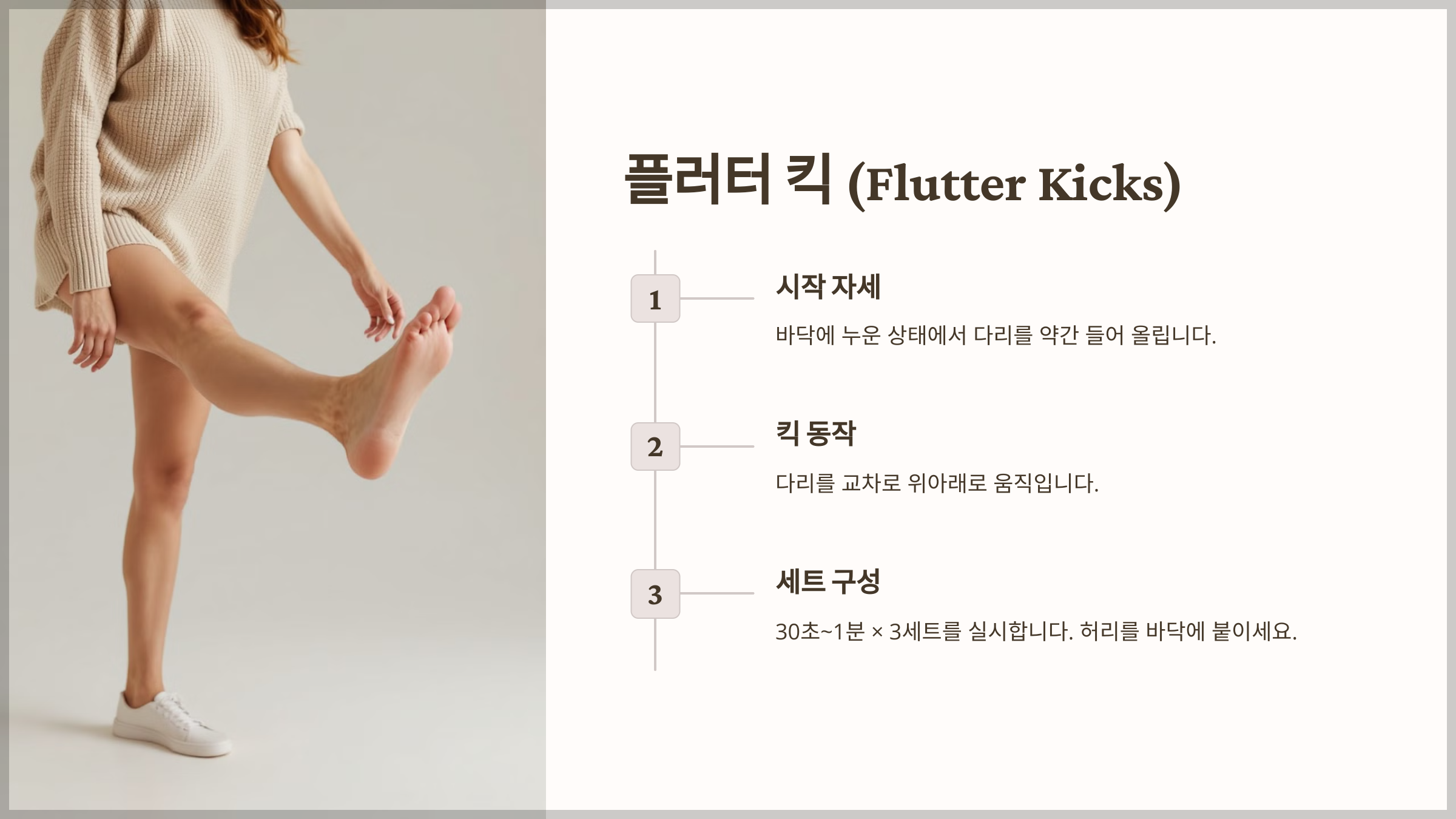 - 포인트: 허리가 바닥에 닿아 있도록 유지하세요.
