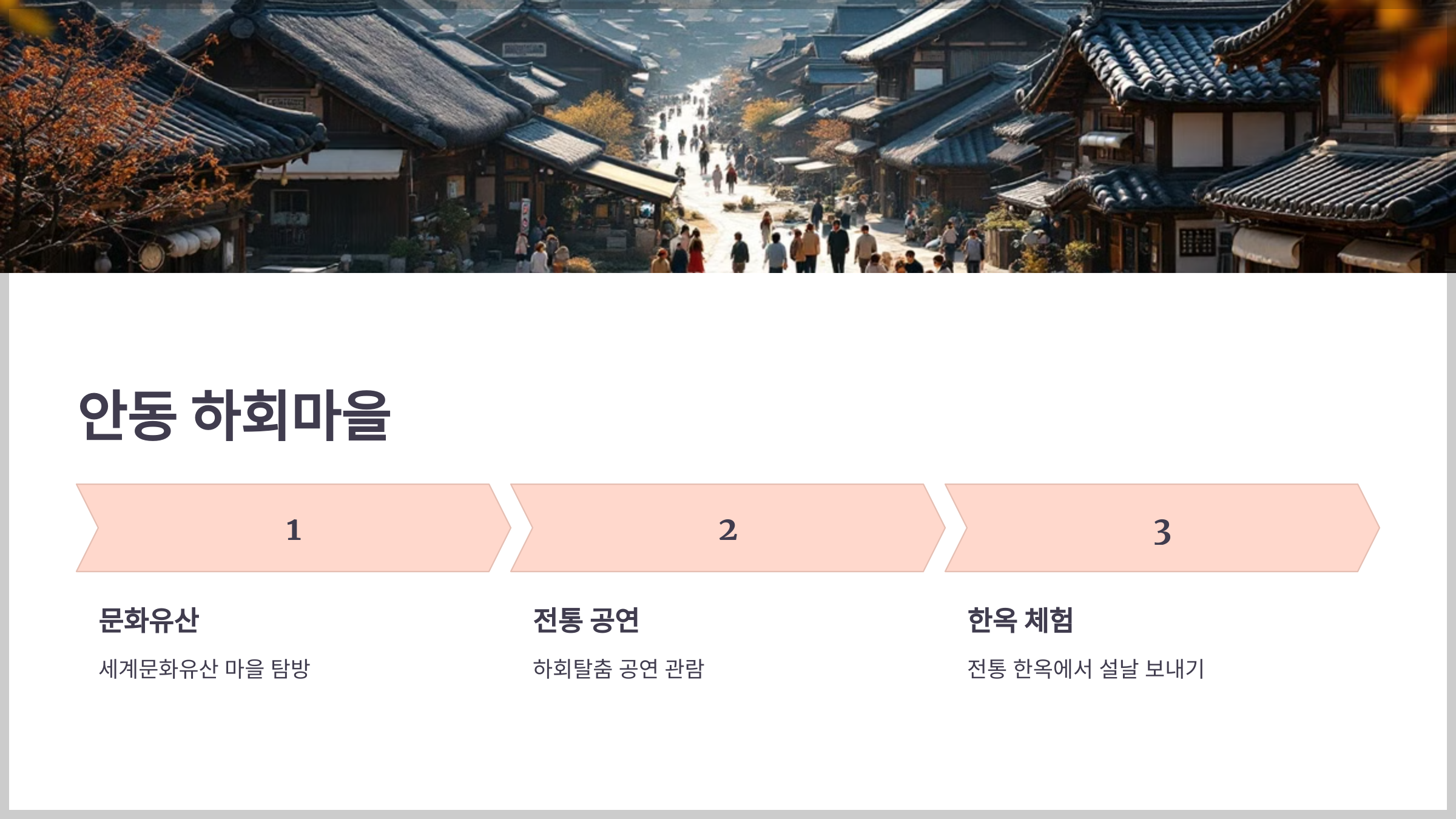 안동 하회마을은 세계문화유산으로 지정된 곳으로, 전통적인 설날 분위기를 만끽할 수 있는 장소입니다. 하회탈춤 공연과 함께 마을 곳곳을 둘러보며 전통 한옥의 매력을 체험할 수 있습니다.