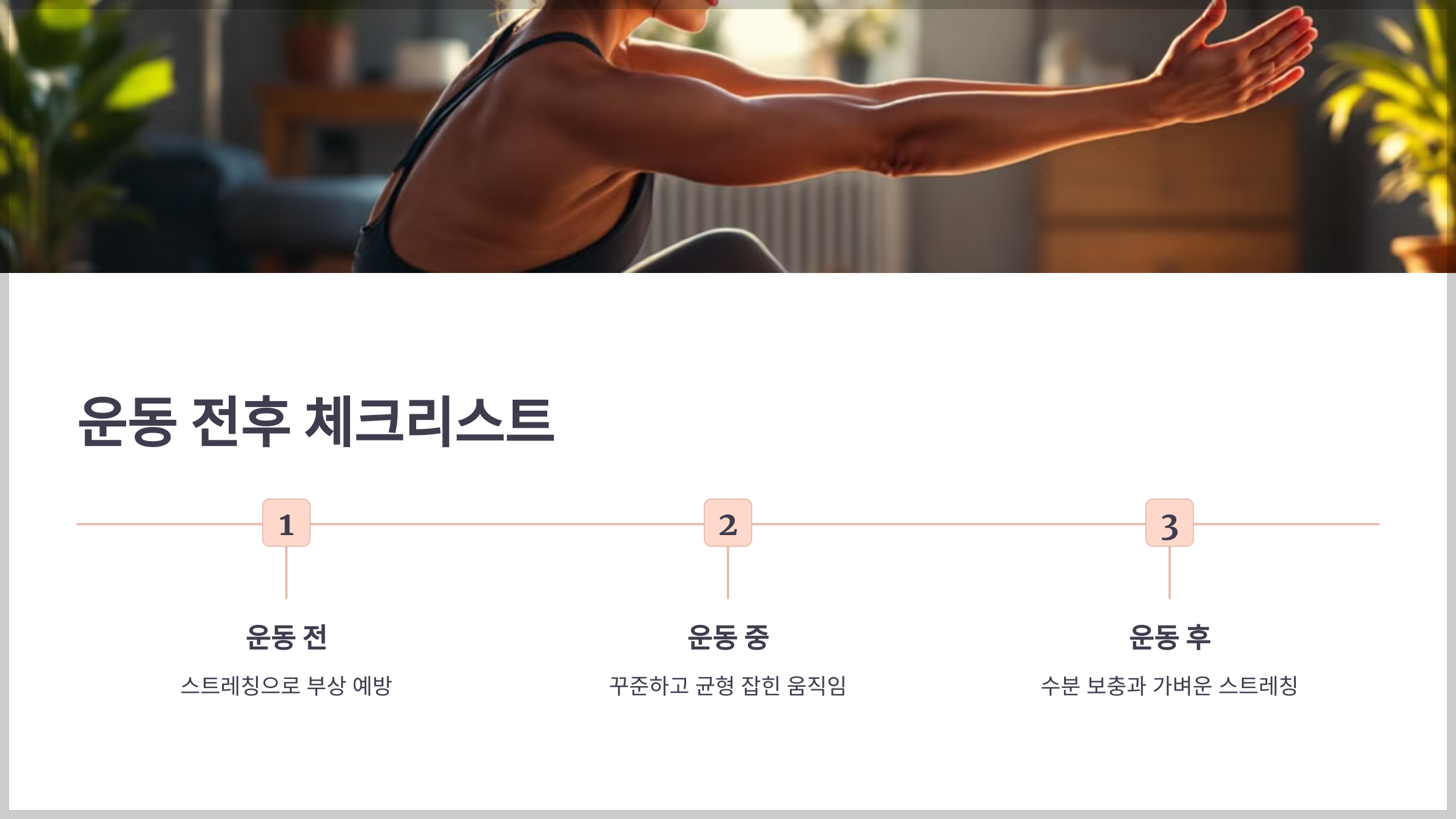 - 운동 후에는 충분한 수분 보충과 가벼운 스트레칭으로 몸을 진정시키세요.