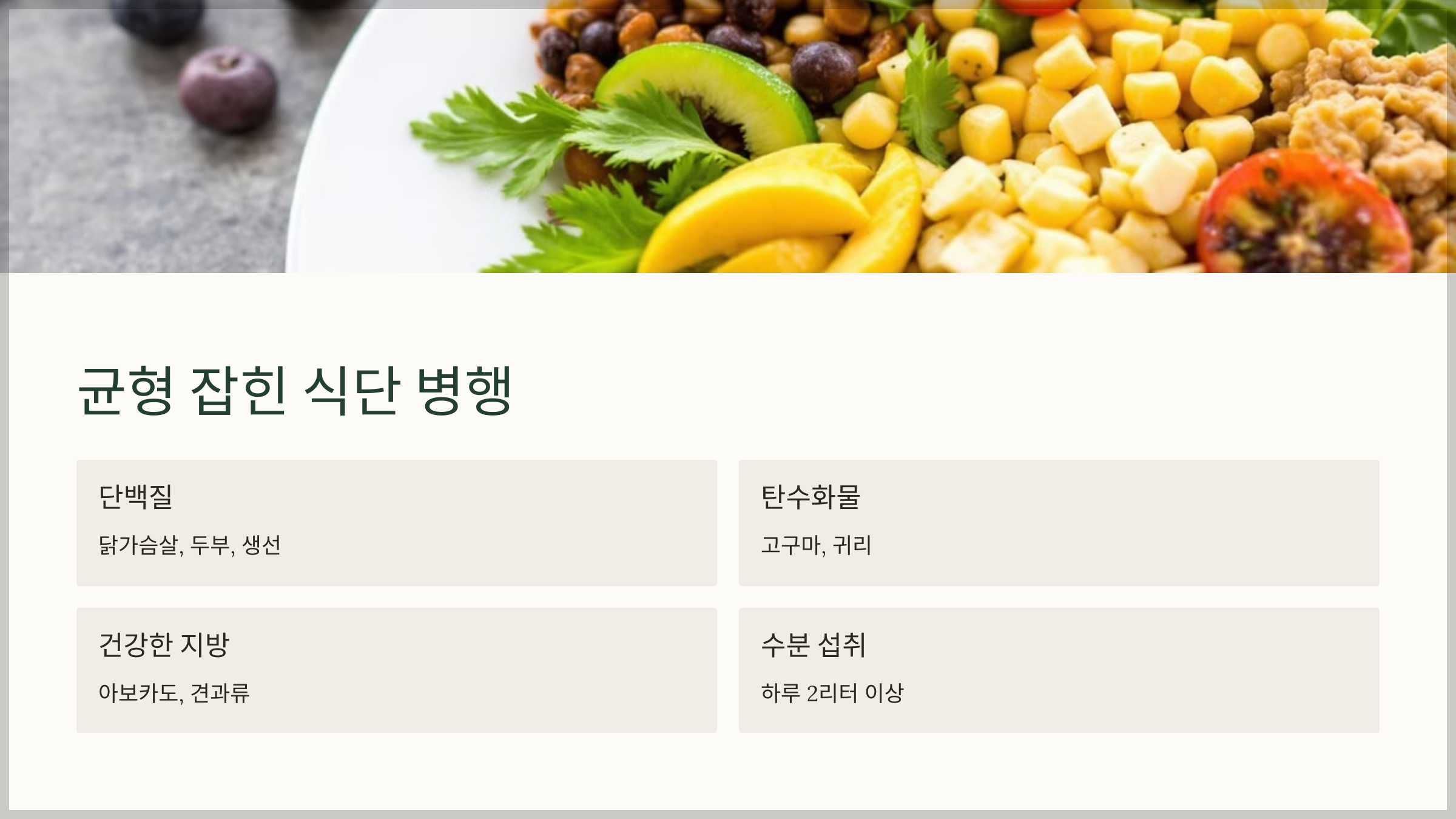 운동만으로는 체중 감량이나 건강 관리를 완벽히 달성하기 어렵습니다. 올바른 식단을 병행해야 운동 효과가 극대화됩니다.