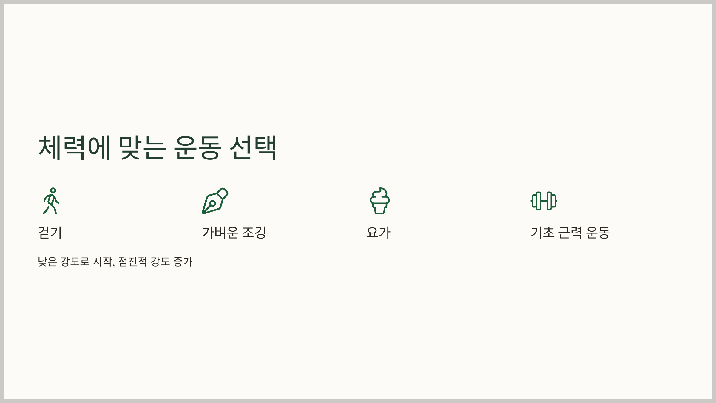 - 추천 운동: 걷기, 가벼운 조깅, 요가, 기초 근력 운동