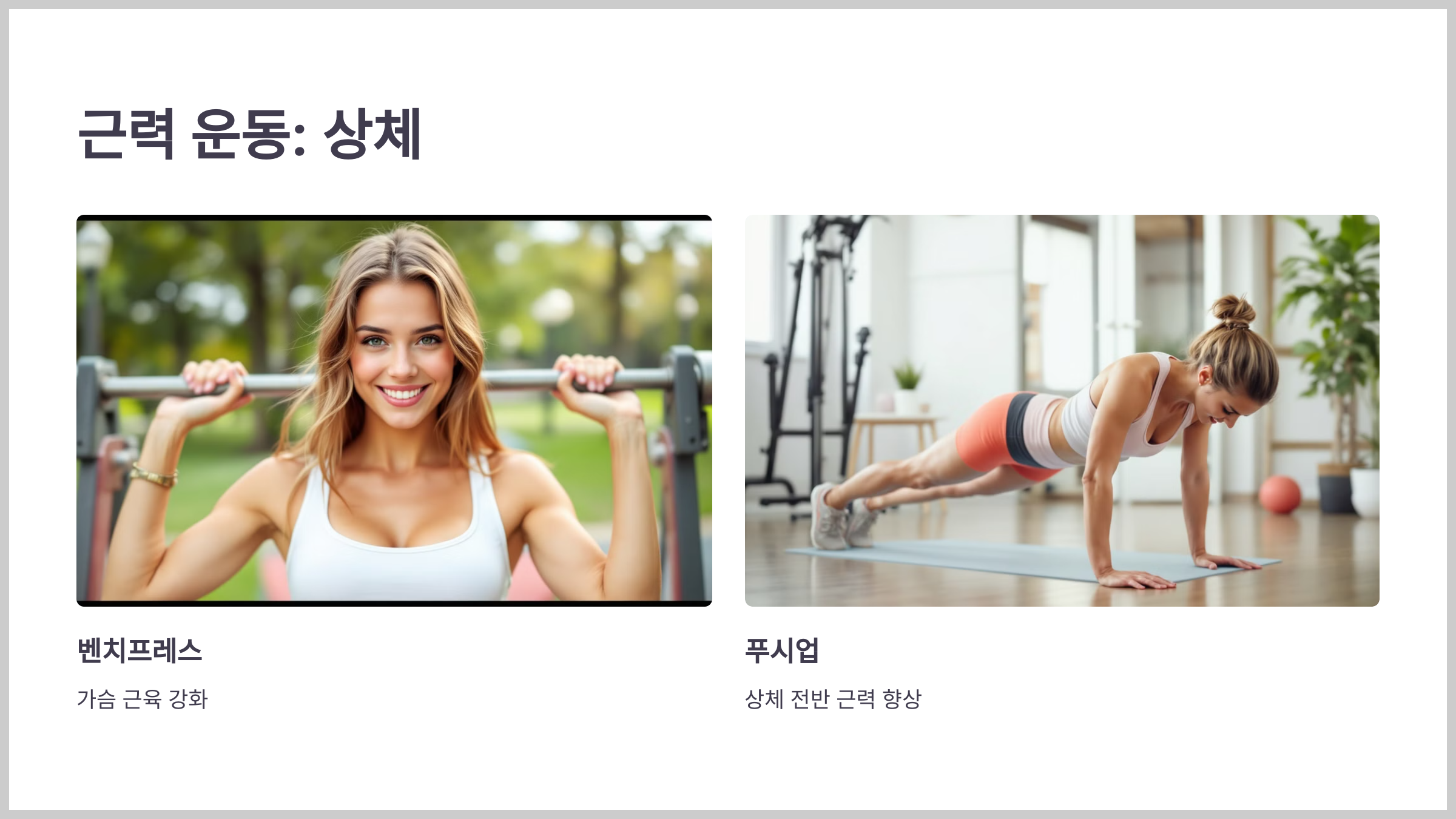 근력 운동은 근육을 강화하고 기초대사량을 높이는 데 필수적입니다. 주요 근육 그룹을 타겟으로 하는 복합 운동을 포함하세요.