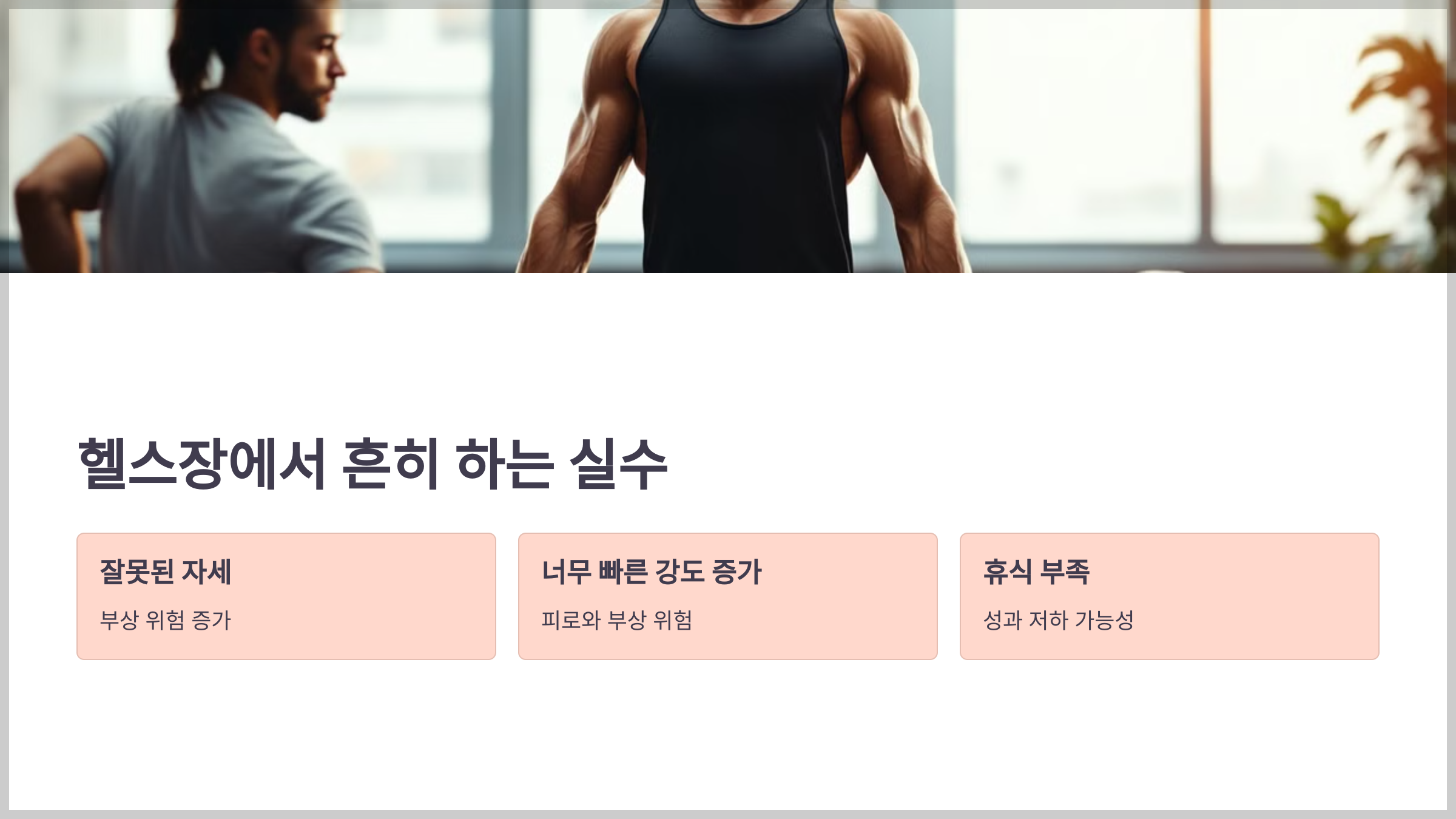 - 잘못된 자세: 잘못된 운동 자세는 부상의 원인이 됩니다. 👉 트레이너의 도움을 받아 올바른 자세를 배우세요.