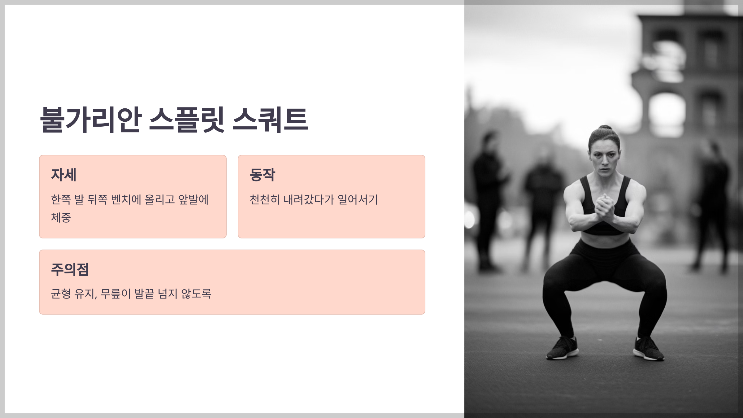- 포인트: 균형을 유지하며 무릎이 발끝을 넘지 않도록 주의하세요.