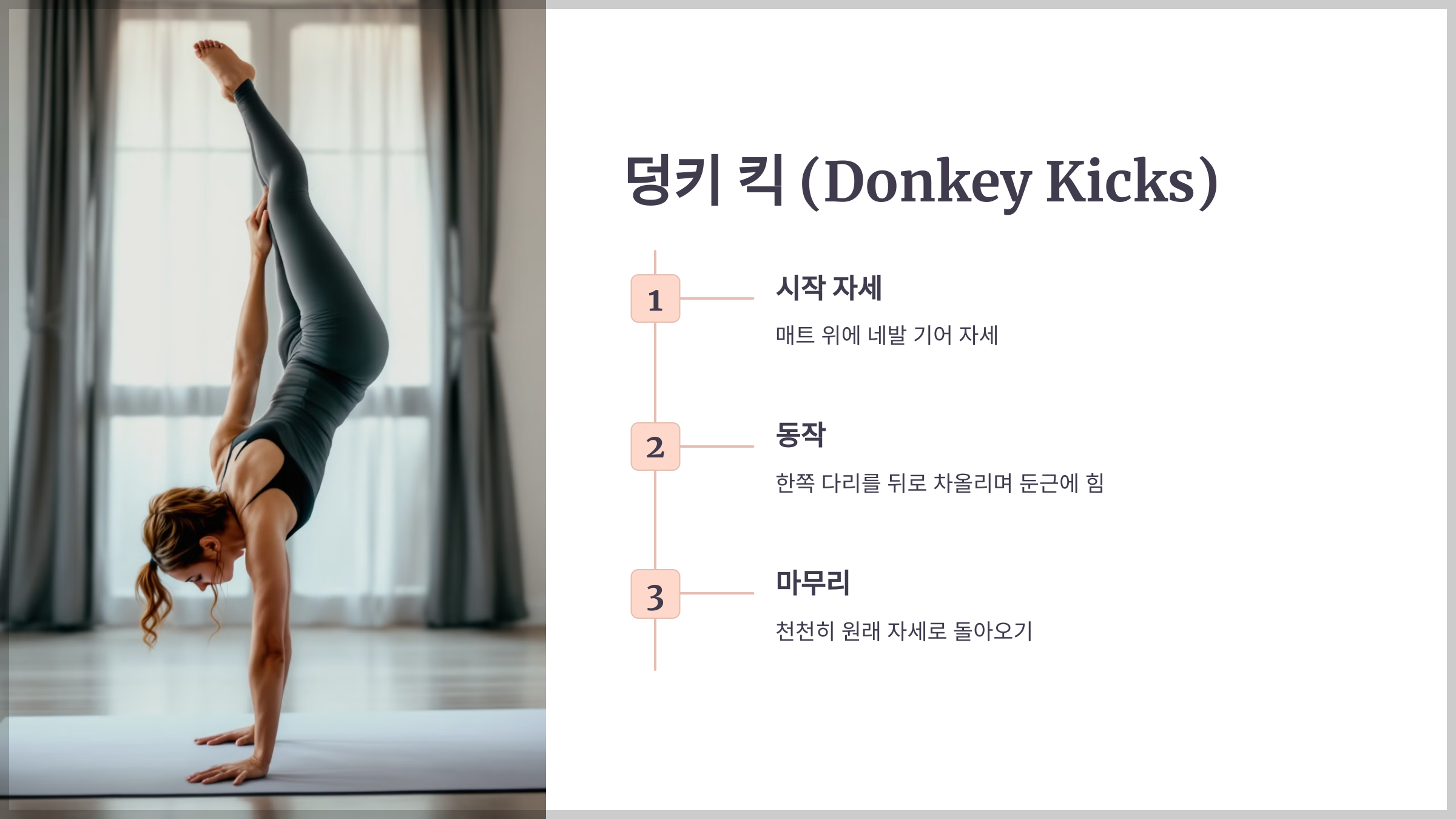 - 포인트: 엉덩이를 완전히 수축하며 천천히 동작을 진행하세요.
