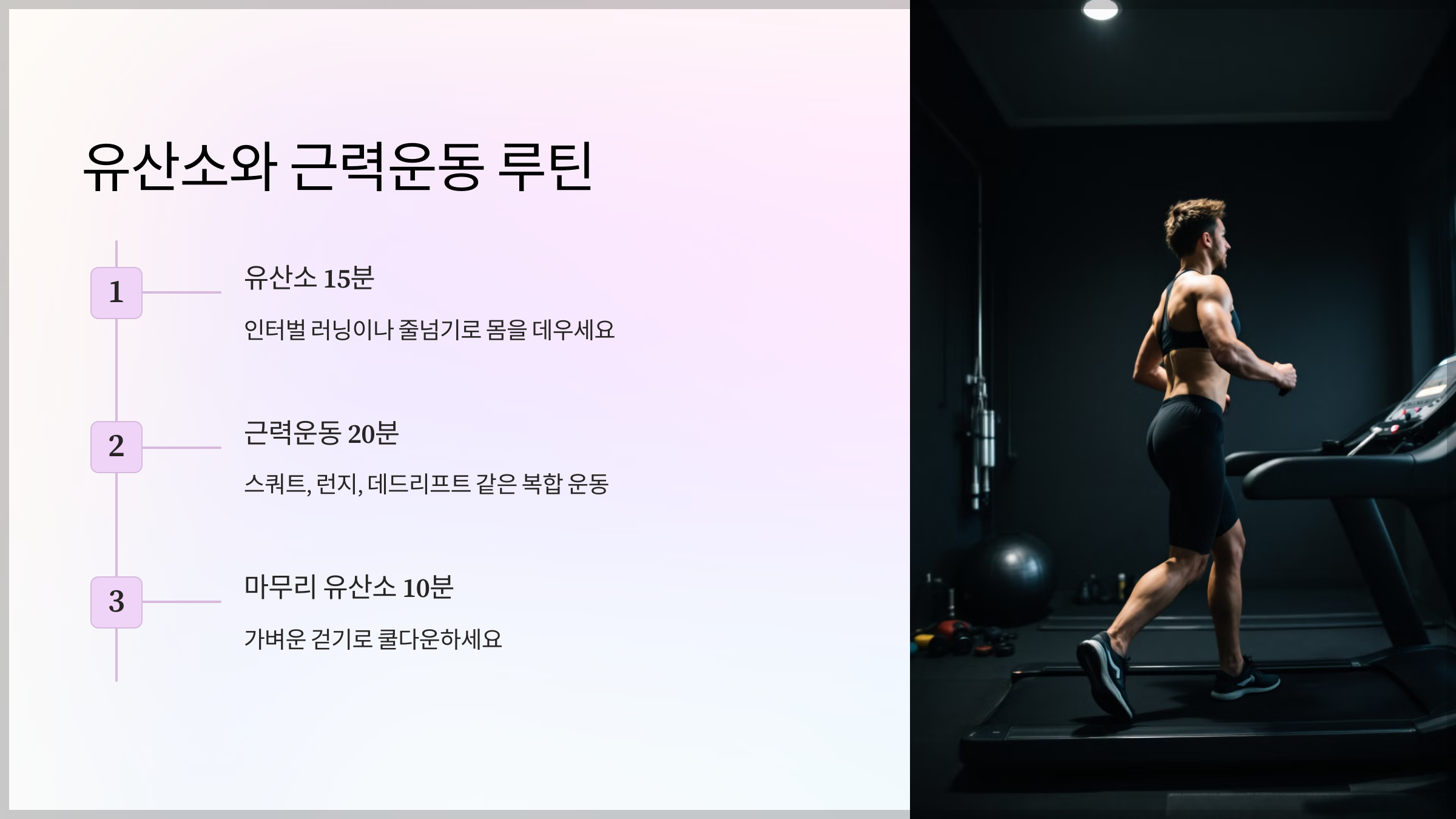 - 마무리 유산소 10분: 가벼운 걷기로 쿨다운하세요.