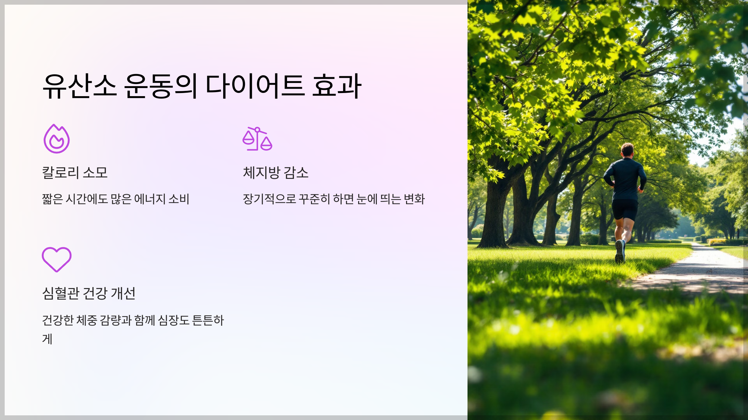 - 유산소 운동: 칼로리 소모와 체지방 감량에 탁월