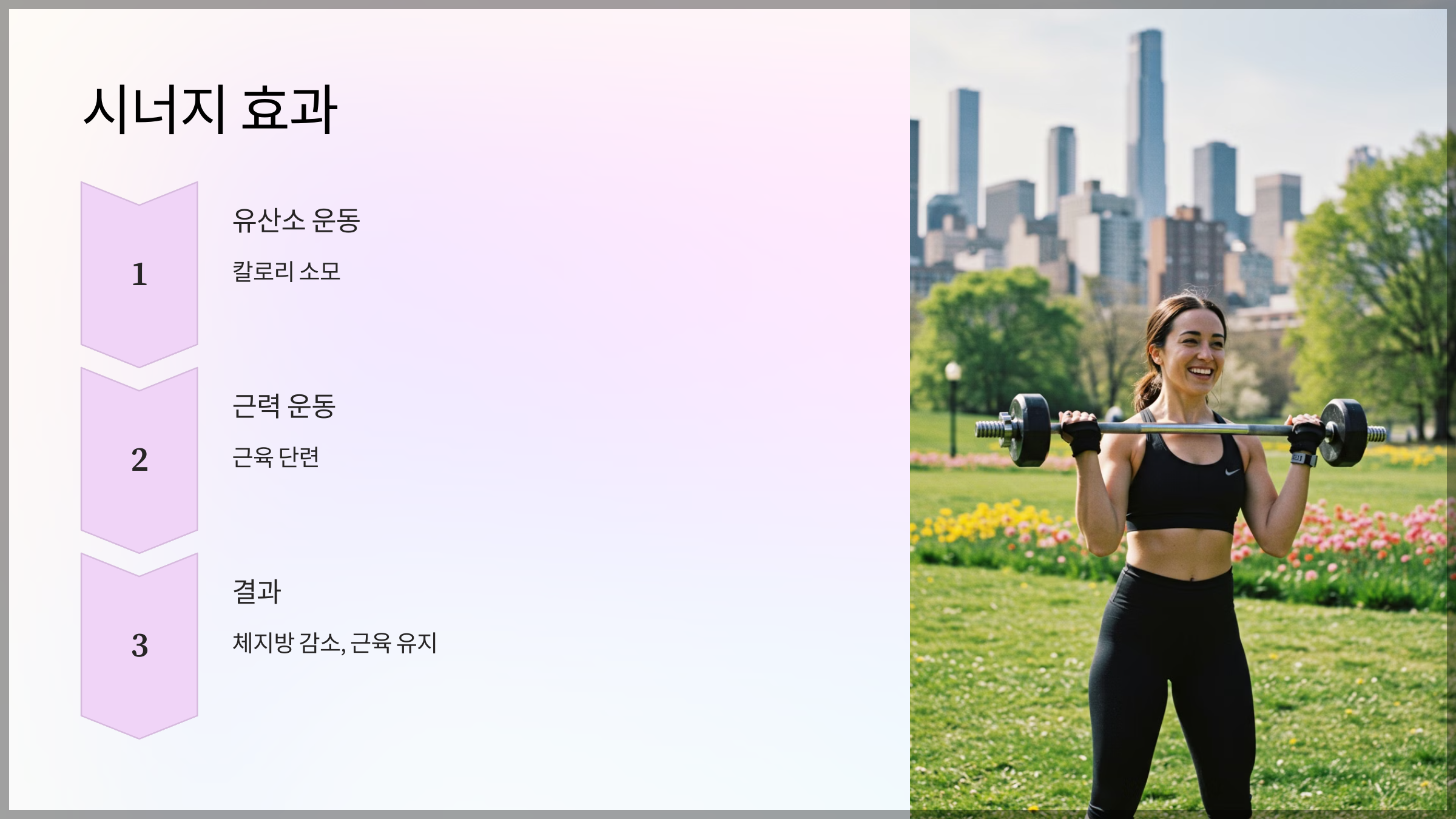 예시: 러닝 후 스쿼트를 진행하면, 심혈관 기능을 강화하는 동시에 하체 근육을 단련할 수 있습니다.