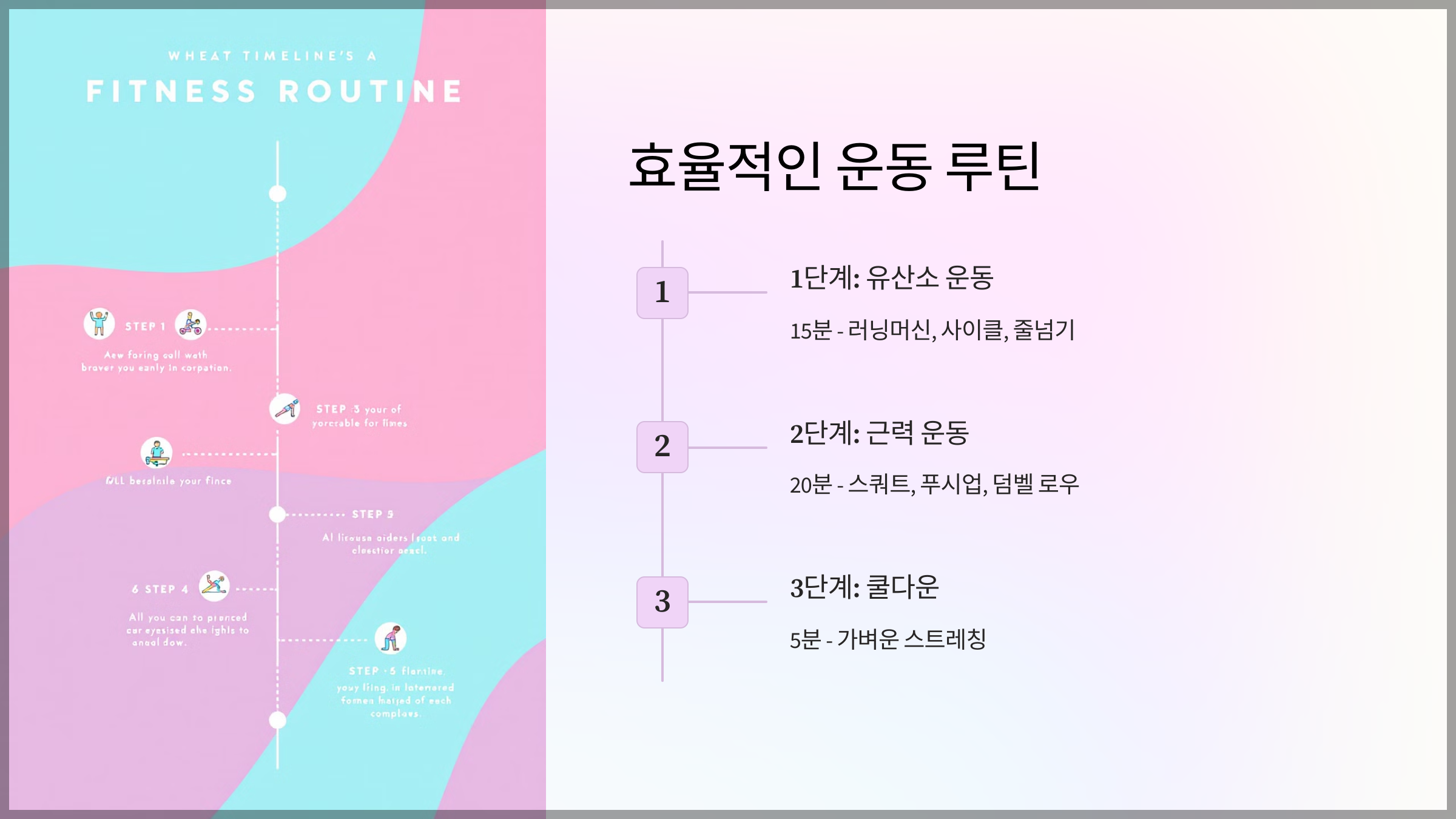 - 3단계: 쿨다운 (5분): 가벼운 스트레칭으로 마무리.