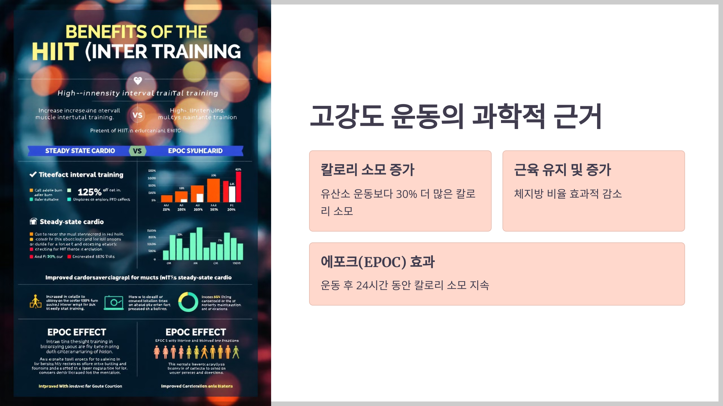 특히 “에포크(EPOC, Excess Post-Exercise Oxygen Consumption)” 효과 덕분에 운동 후 최대 24시간 동안 칼로리 소모가 지속됩니다. 따라서 짧은 시간 내에도 높은 운동 강도로 체중 감량을 실현할 수 있습니다.