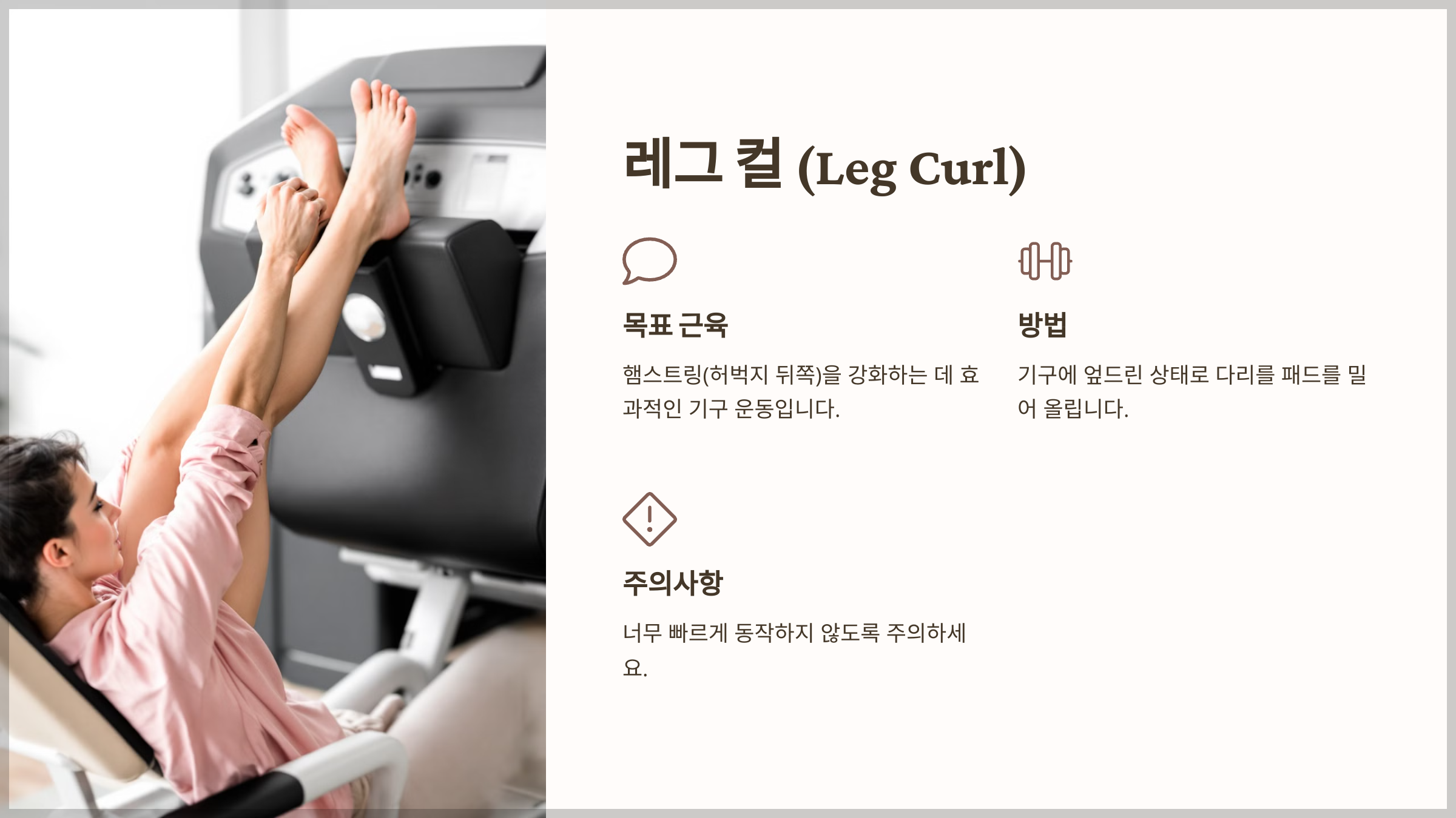 햄스트링(허벅지 뒤쪽)을 강화하는 데 효과적인 기구 운동입니다.
