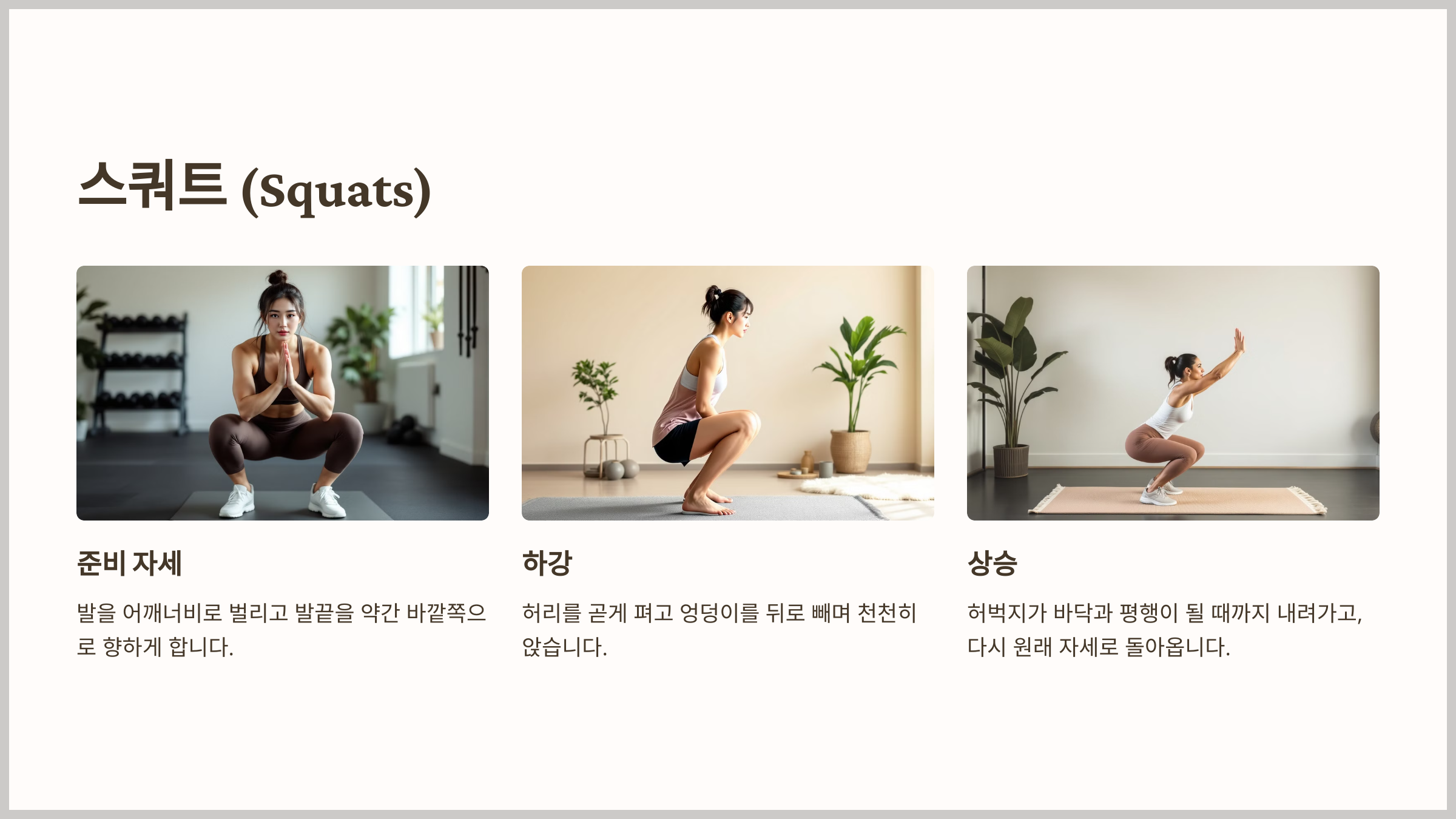 - 허벅지가 바닥과 평행이 될 때까지 내려가고, 다시 원래 자세로 돌아옵니다.