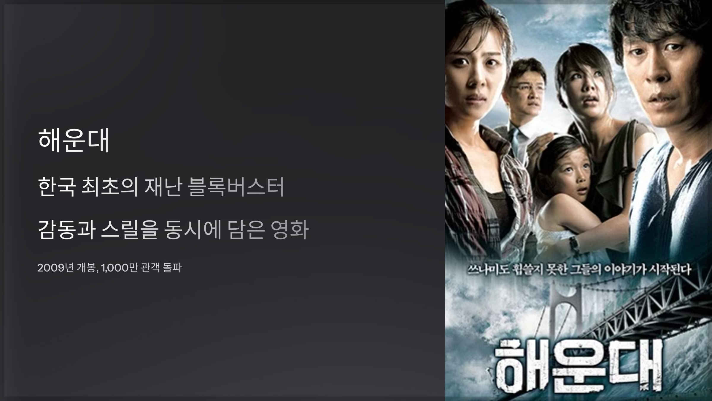 해운대(Haeundae, 2009)는 윤제균 감독이 연출한 한국 최초의 본격적인 재난 영화로, 단순한 재난 블록버스터가 아니라 휴먼 드라마와 긴장감 넘치는 액션이 결합된 작품이다. 개봉 당시 1,000만 관객을 돌파하며 큰 흥행을 기록했으며, 재난 영화라는 장르를 한국 영화계에 본격적으로 도입한 기념비적인 작품으로 평가받는다.