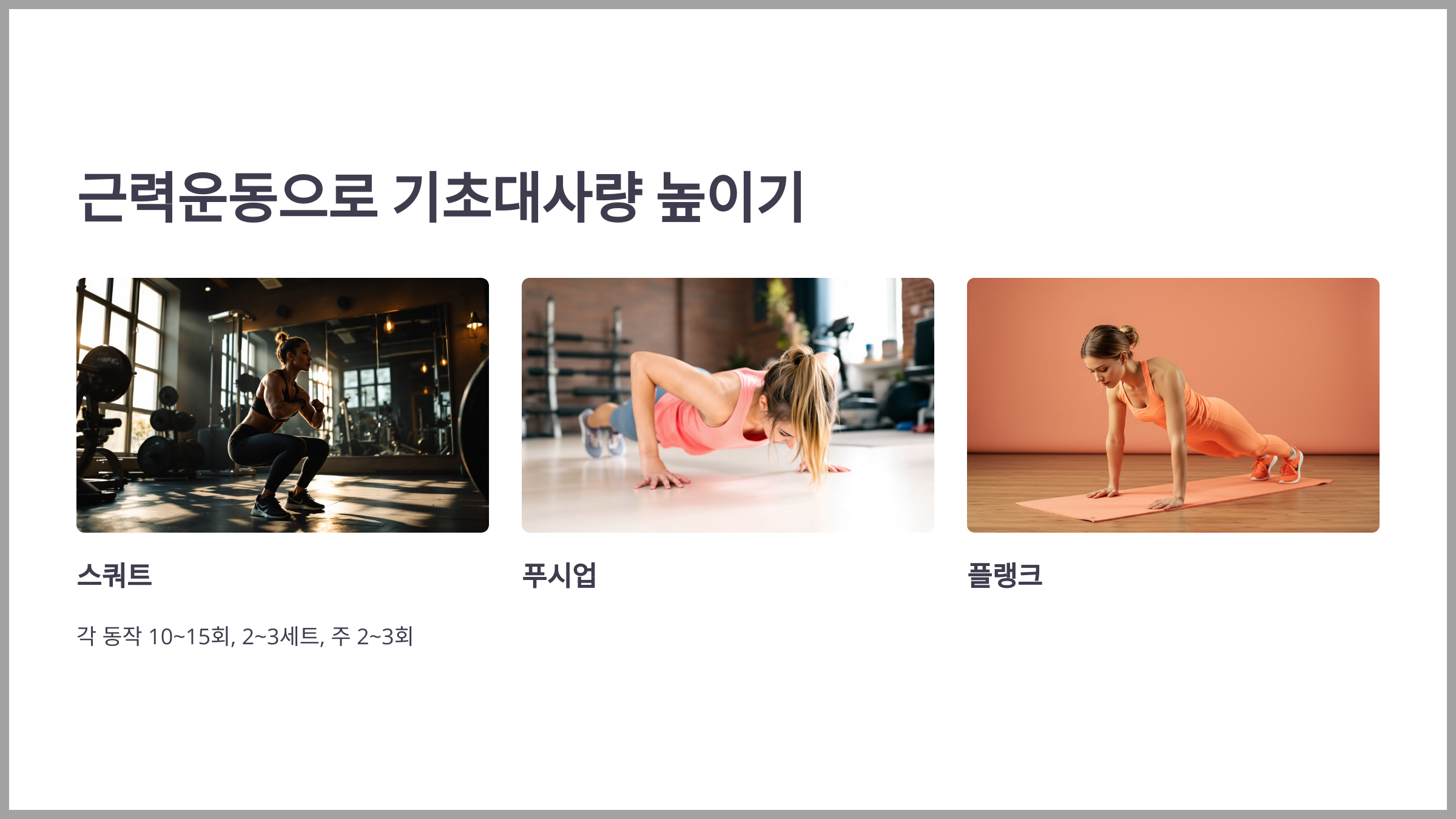 근력운동은 체지방을 태우고 근육량을 늘려 기초대사량을 높입니다. 초보자는 맨몸운동부터 시작하는 것이 좋습니다.
